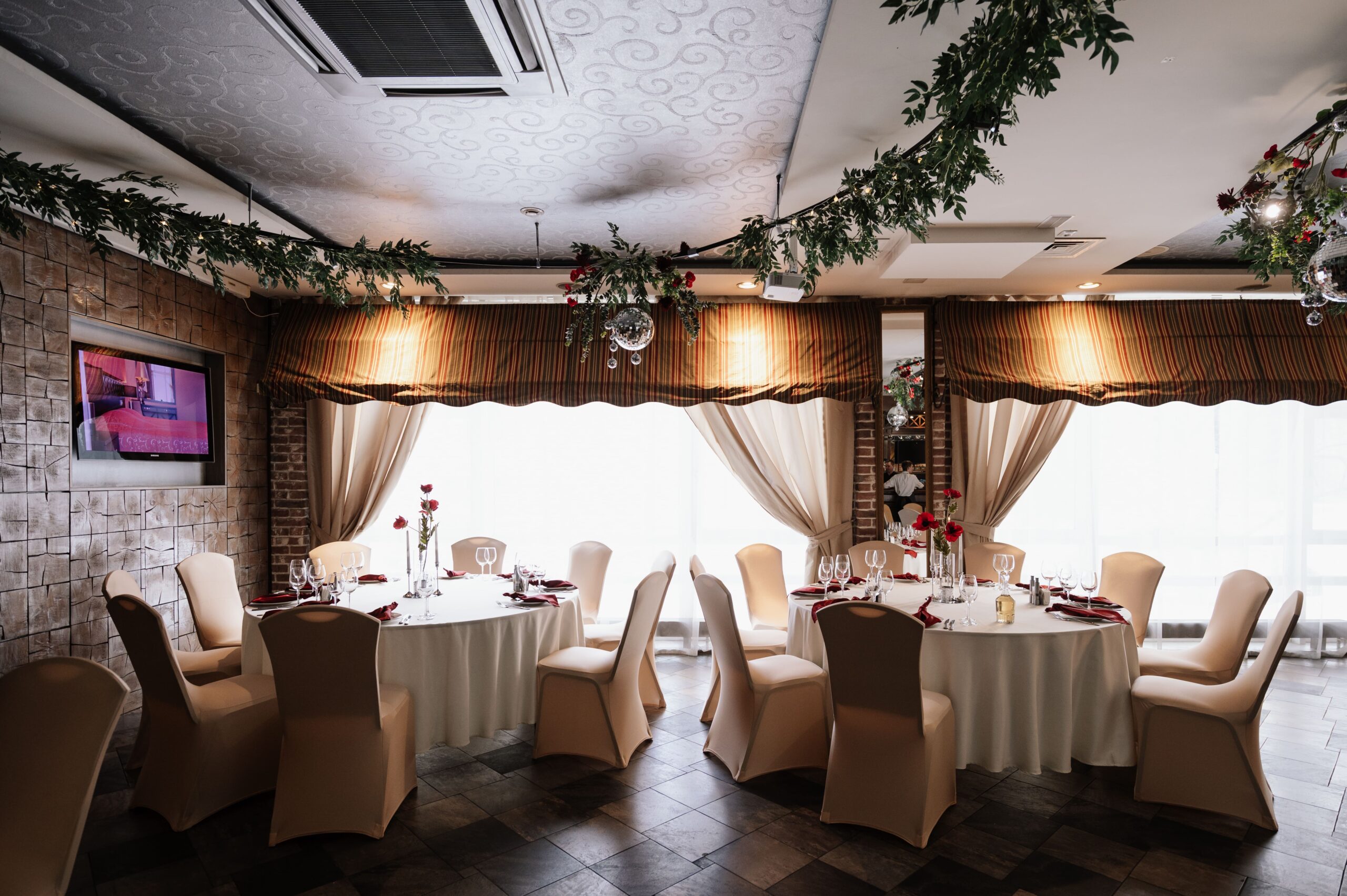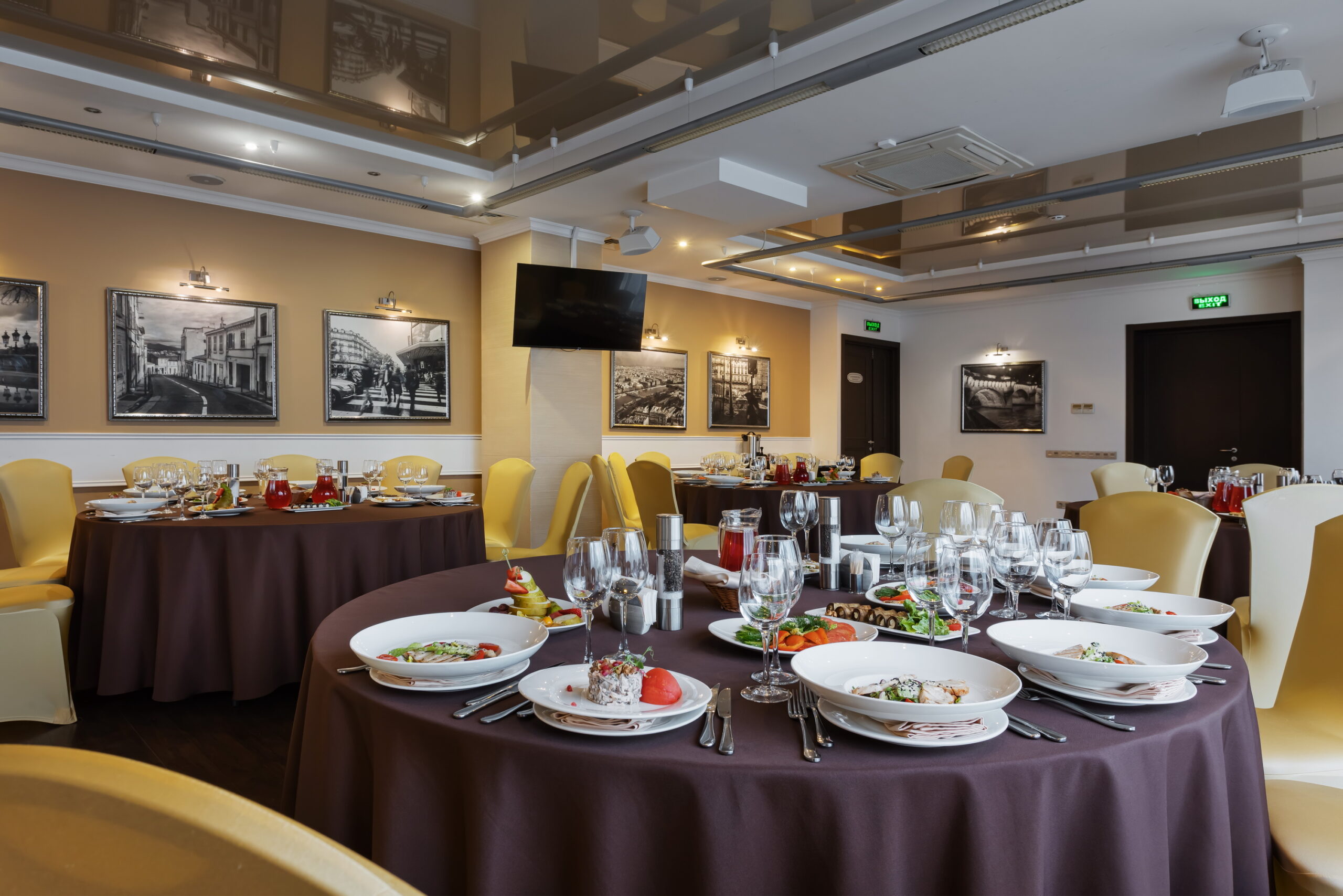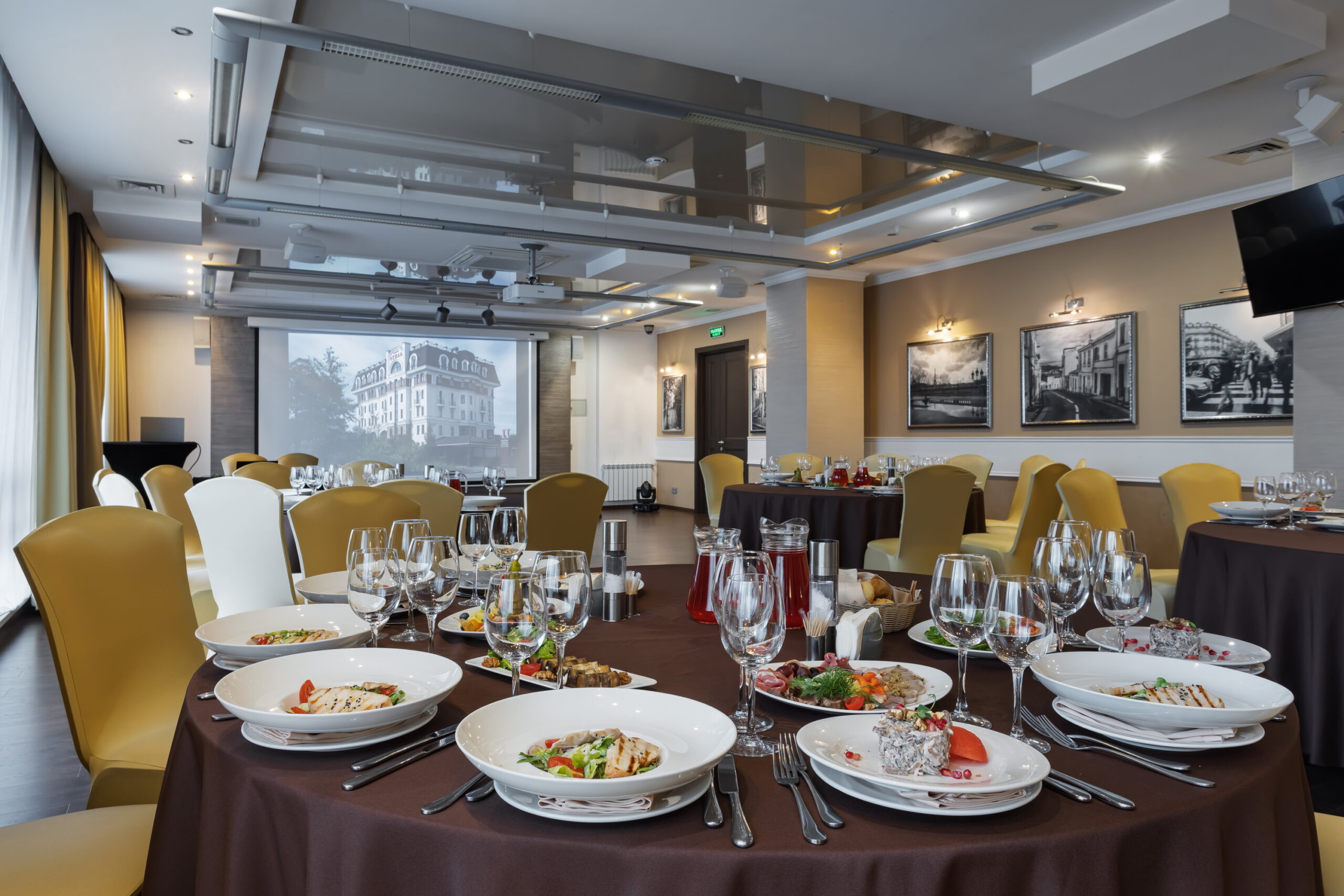 Зал находится на первом этаже отеля Пале Рояль. Классический интерьер, панорамные окна, круглые столы, банкетный текстиль в кремово-шоколадной цветовой гамме.