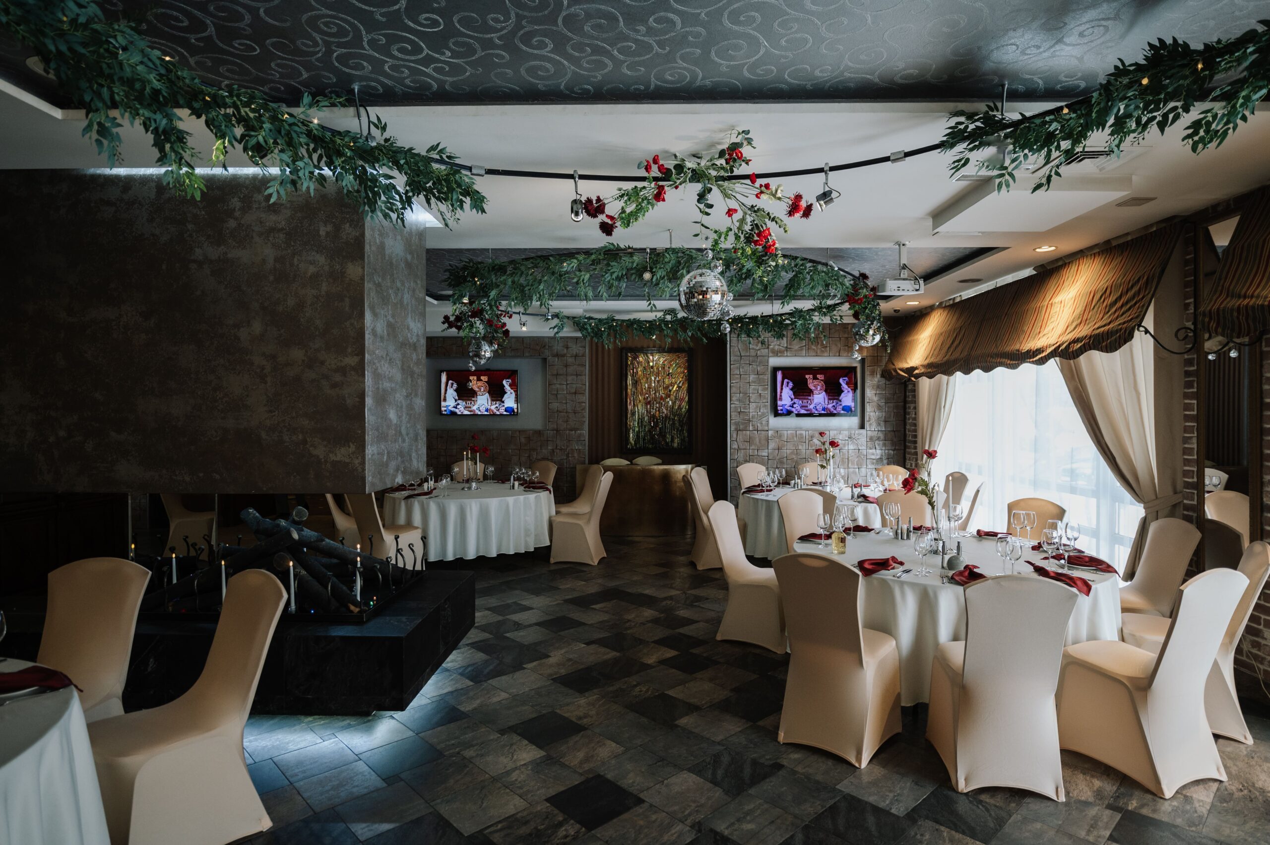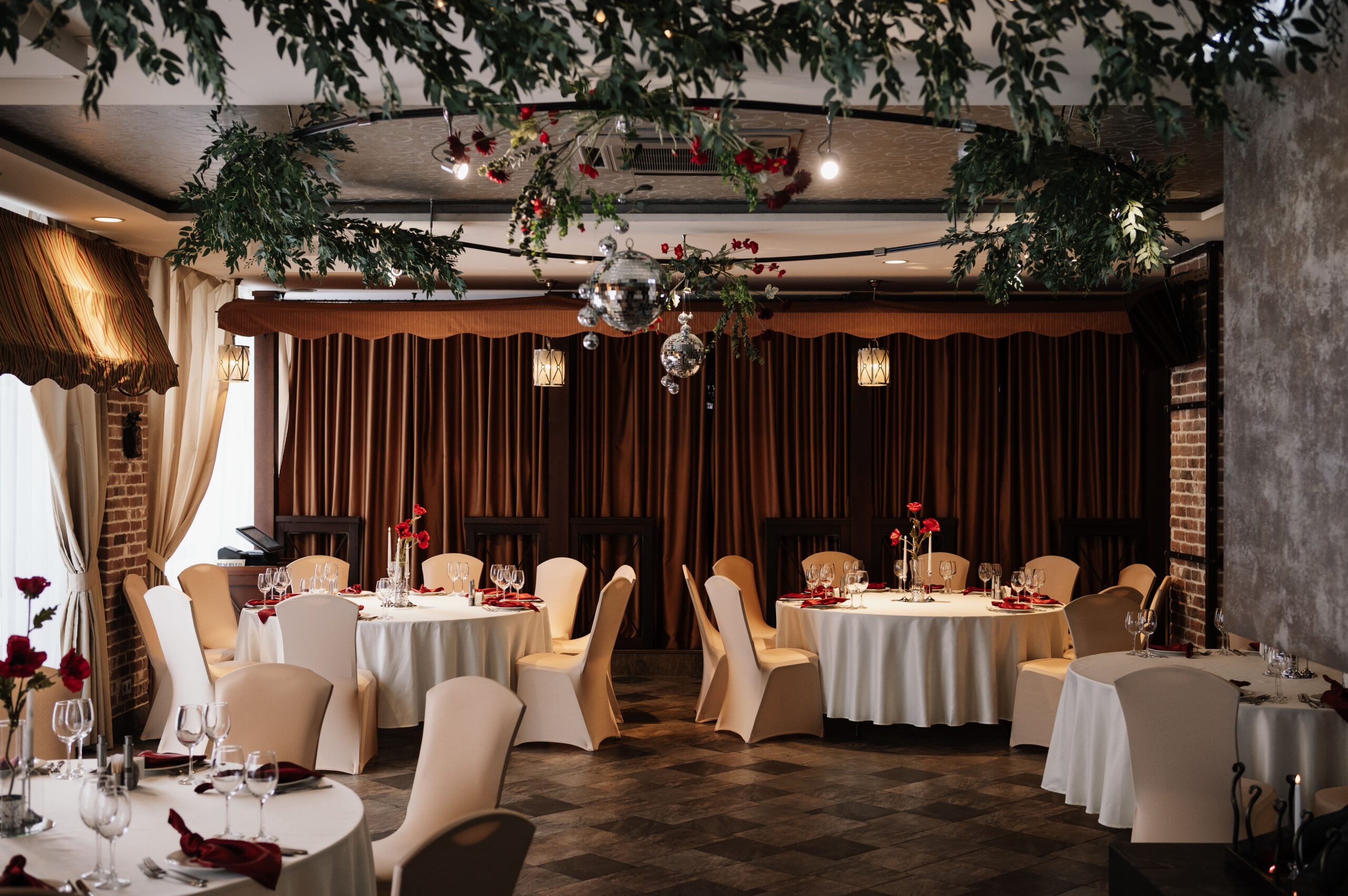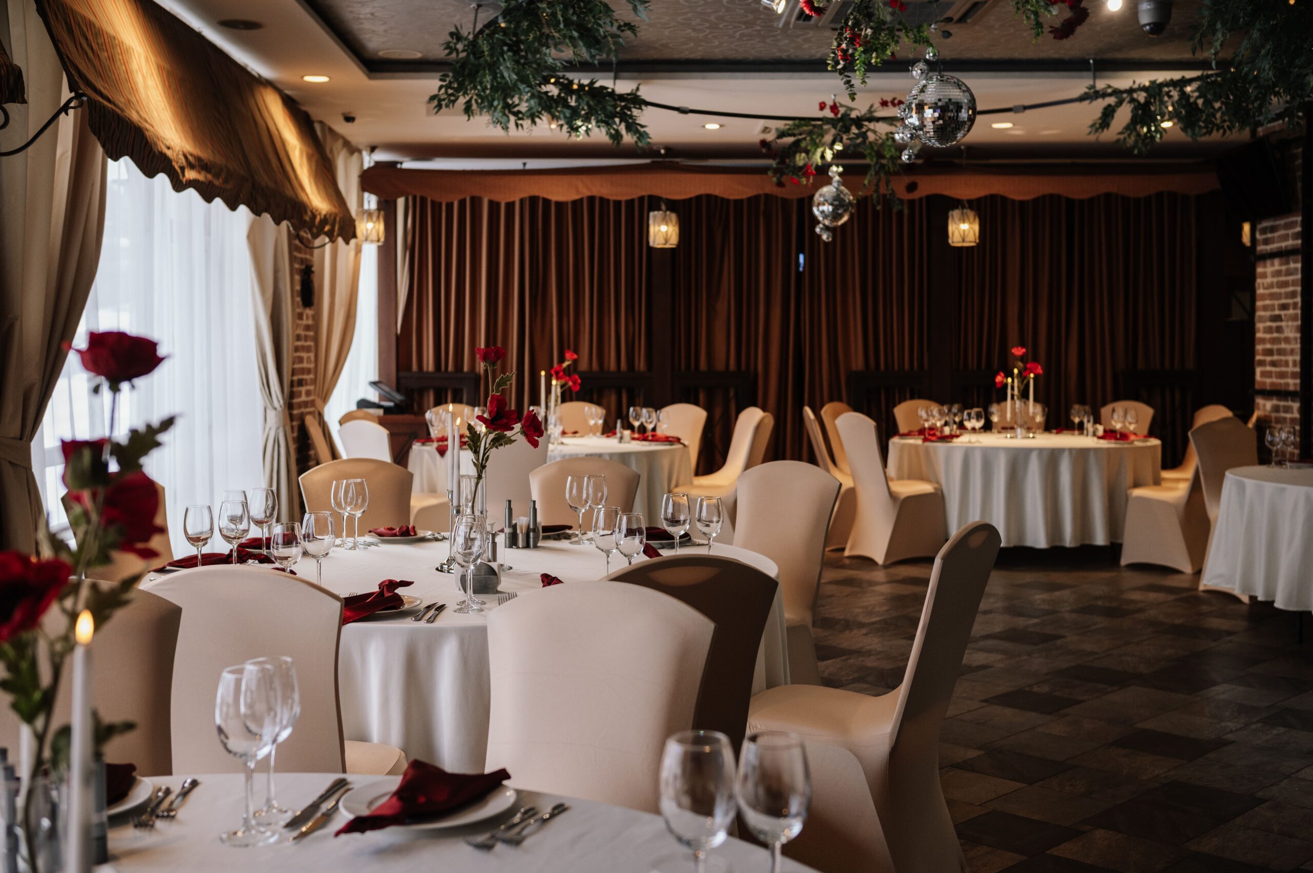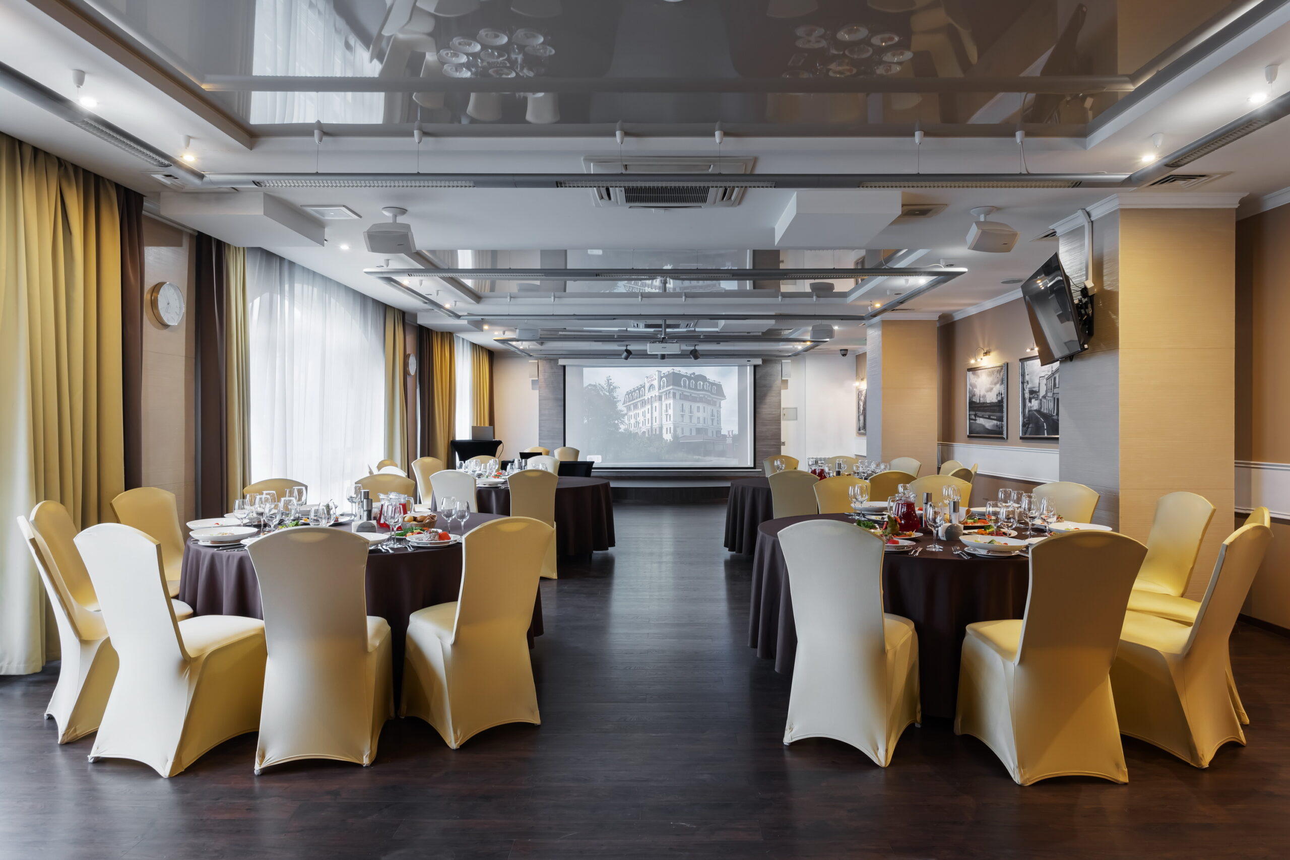 Зал находится на первом этаже отеля Пале Рояль. Классический интерьер, панорамные окна, круглые столы, банкетный текстиль в кремово-шоколадной цветовой гамме.