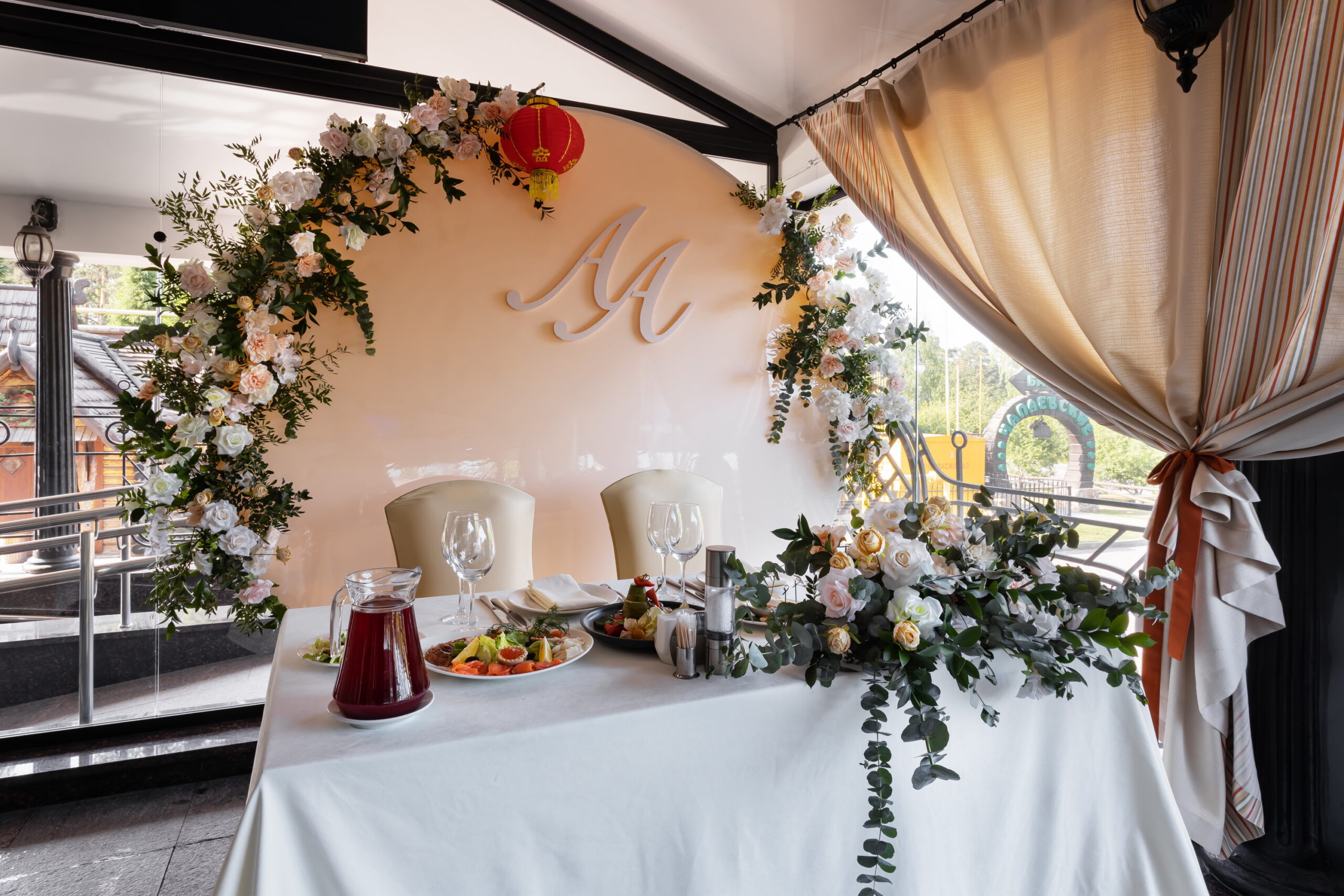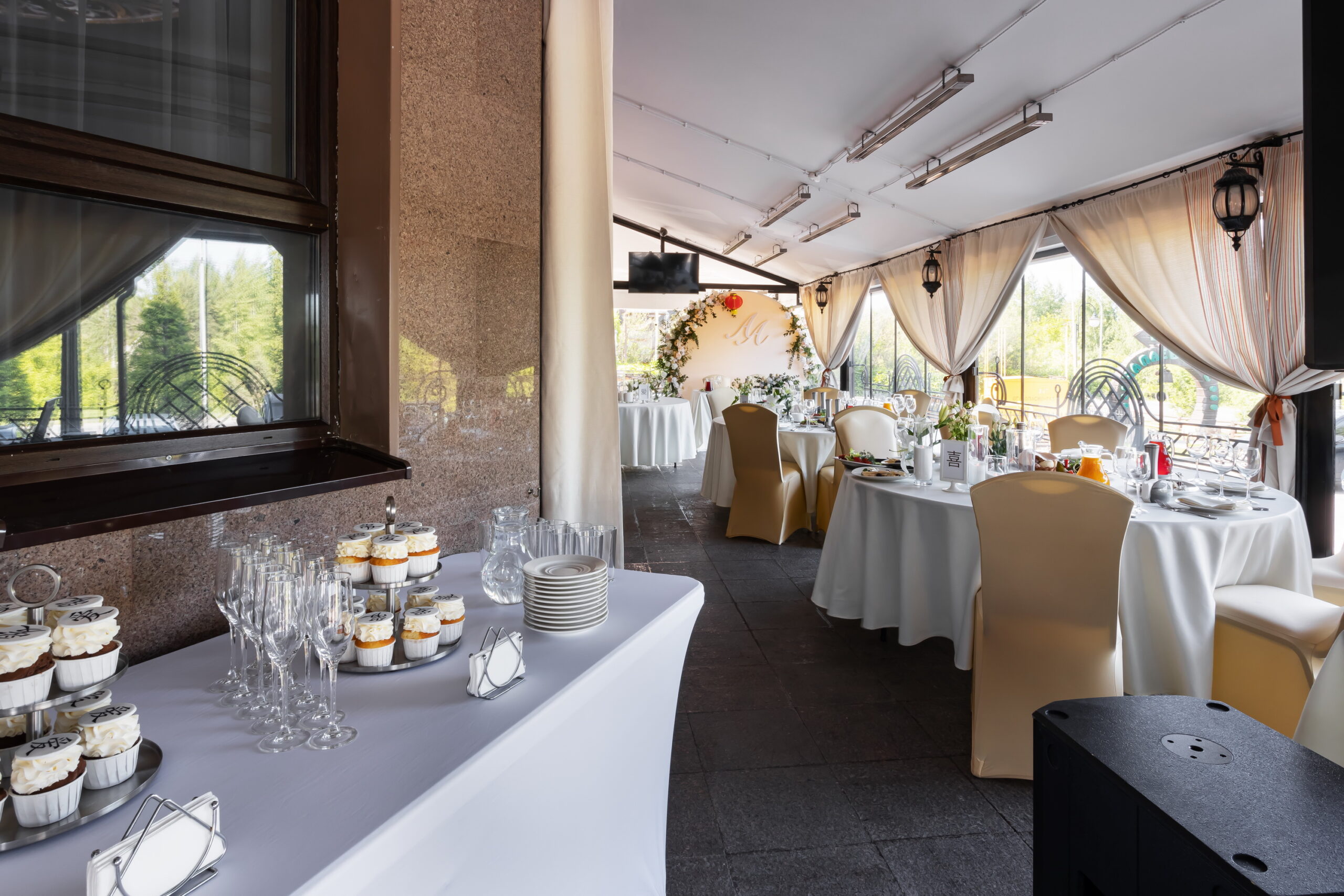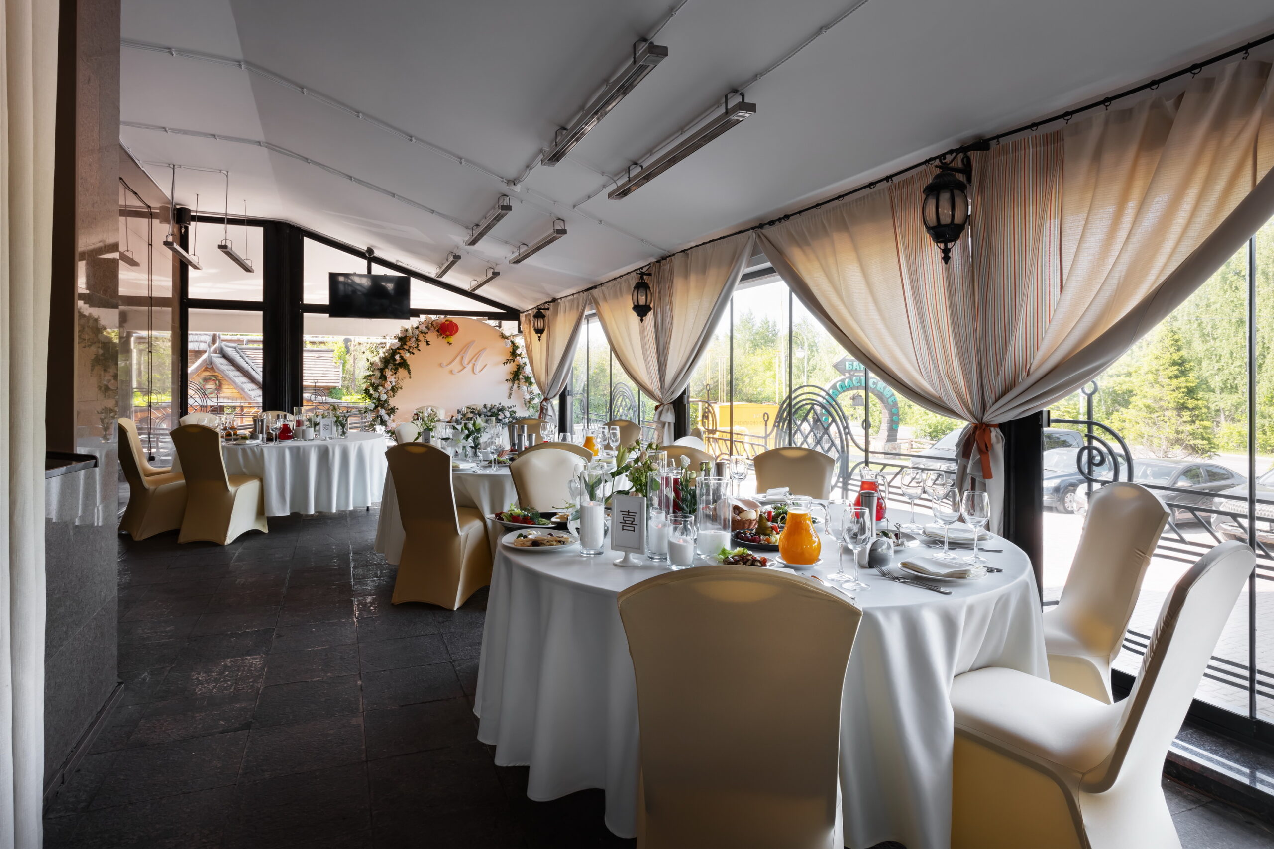 Летняя терраса с панорамными окнами — это место, где можно отпраздновать камерную свадьбу на свежем воздухе, организовать фуршет или выездную регистрацию.